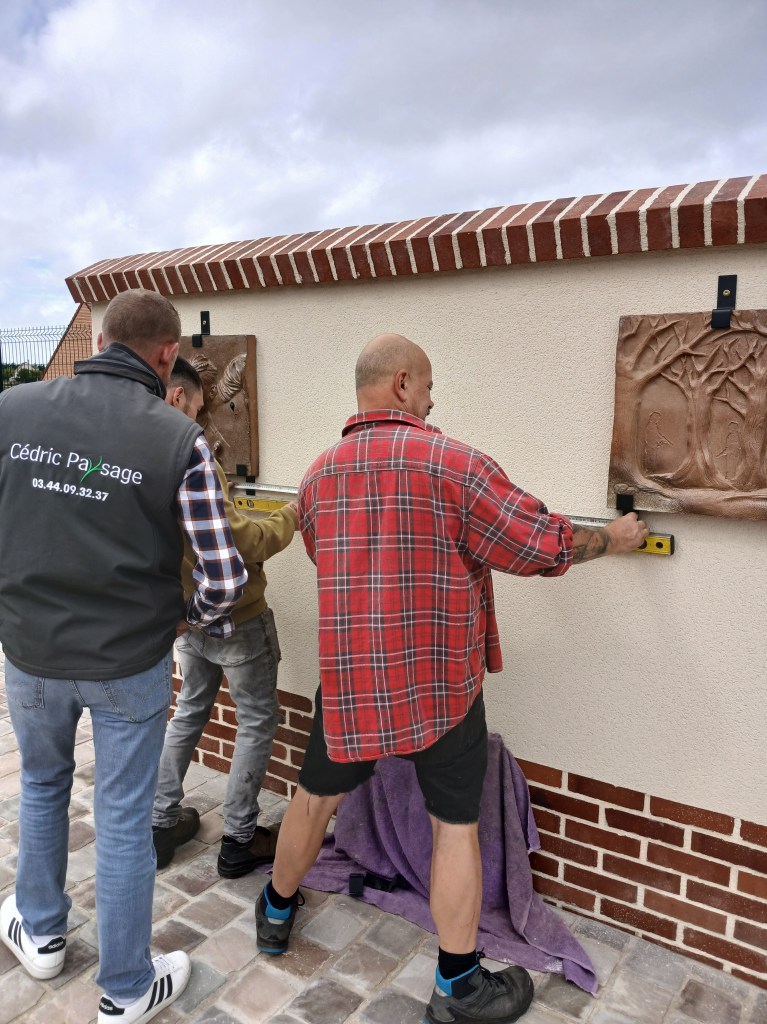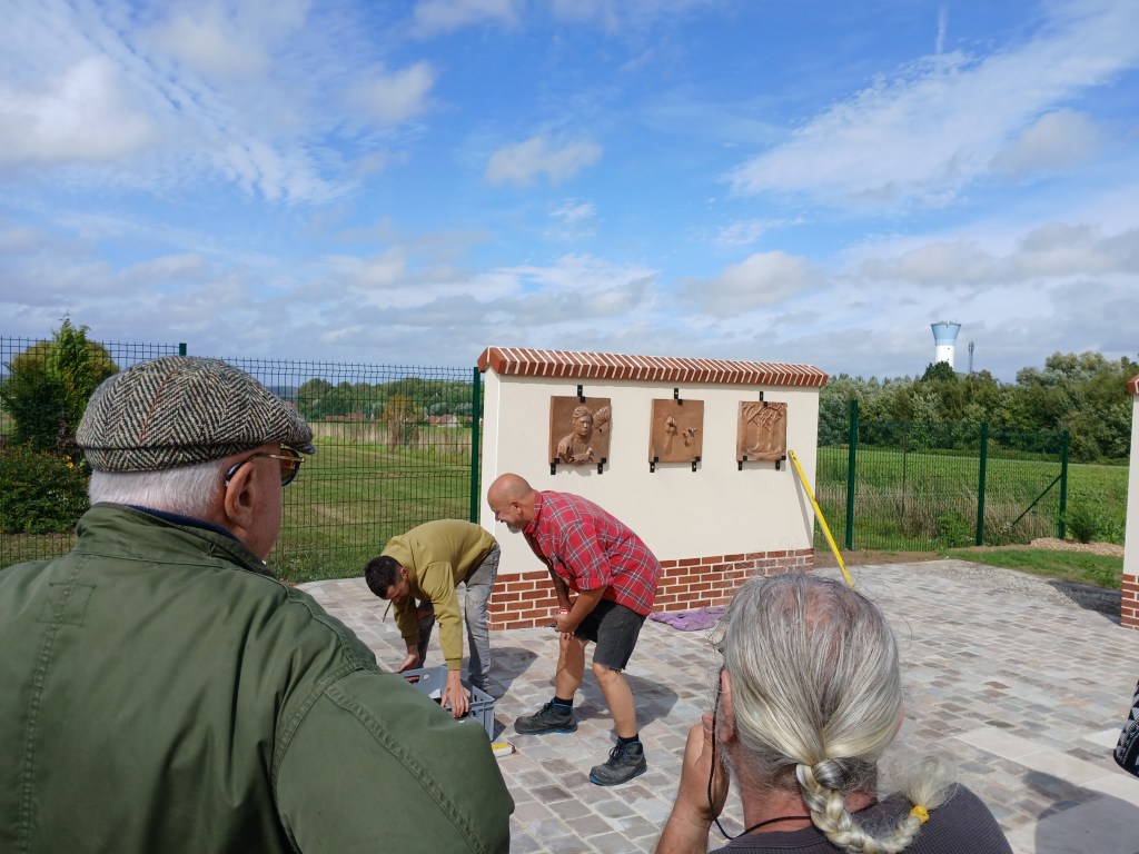 L’entreprise Cédric Paysage a, pour l’occasion, fait appel à l’atelier FerPlay de Varesnes pour réaliser la délicate tâche de fixer les bas-reliefs sous le regard attentif de leur créateur, le sculpteur Didier Paigneau. Le maire de Crisolles, un journaliste et d’autres personnes ont pu aussi assister à l’aboutissement d’un travail commencé en début d’année avec les élèves de Première et de Terminale de la spécialité Arts plastiques du lycée Jean Calvin (Noyon). Leurs esquisses ont inspiré le sculpteur qui a ensuite laissé place à tout son talent, son imagination pour créer une série de 12 bas-reliefs représentant les 6 thématiques centrales du mémorial de l’entrée en guerre en 1939 à la liberté retrouvée en 1945.
