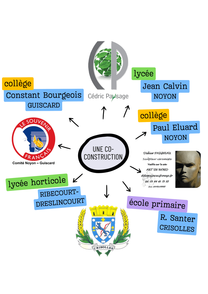 Le choix du maître d’œuvre s’est porté sur l’entreprise Cédric Paysage de Ribécourt qui réalise l’ensemble du mémorial. Deuxième maître d’œuvre, le sculpteur et céramiste, Didier Paigneau de Canny-sur-Matz. Tous deux travaillent sur en collaboration avec les établissements scolaires.