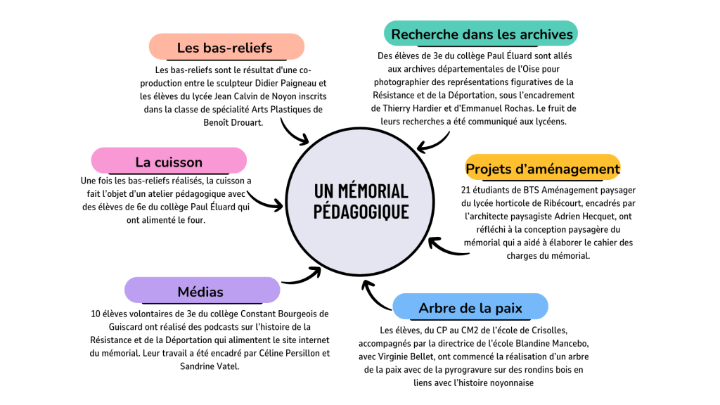 Le mémorial, véritable outil pédagogique, ne peut être efficace que s’il est réalisé par ceux qui en sont les principaux destinataires : les élèves. Cinq établissements du primaire, du secondaire et du supérieur sont ainsi mobilisés sur le projet.